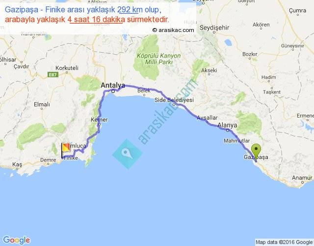 Gazipaşa - Finike arası yaklaşık olarak 90 km/h ile yukarıda belirtilen sürede olup, iki yerin kuş uçuşu uzaklığı (mesafesi) 193'dir. Yolculuk otobüsle 5 saat 32 dakika sürmektedir.