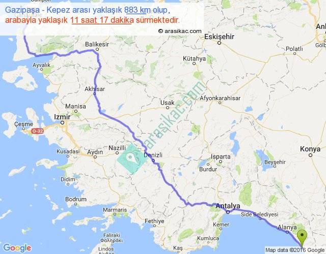 Gazipaşa - Kepez arası yaklaşık olarak 90 km/h ile yukarıda belirtilen sürede olup, iki yerin kuş uçuşu uzaklığı (mesafesi) 666'dir. Eğer belirtilen yerler arasında uçak seferi var ise bu süre uçakla 1 saat 01 dakika'ya kadar düşebilir. Yolculuk otobüsle 14 saat 40 dakika sürmektedir.