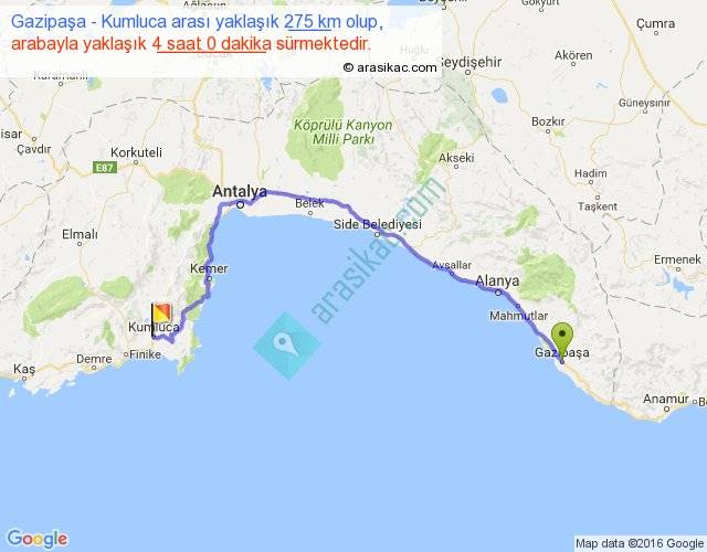 Gazipaşa - Kumluca arası yaklaşık olarak 90 km/h ile yukarıda belirtilen sürede olup, iki yerin kuş uçuşu uzaklığı (mesafesi) 181'dir. Yolculuk otobüsle 5 saat 12 dakika sürmektedir.