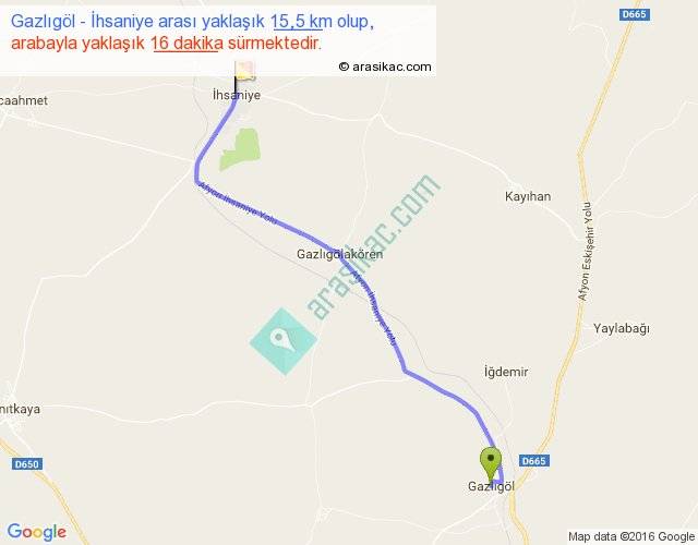 Gazlıgöl - İhsaniye arası yaklaşık olarak 90 km/h ile yukarıda belirtilen sürede olup, iki yerin kuş uçuşu uzaklığı (mesafesi) 13'dir. Yolculuk otobüsle 20 dakika sürmektedir.