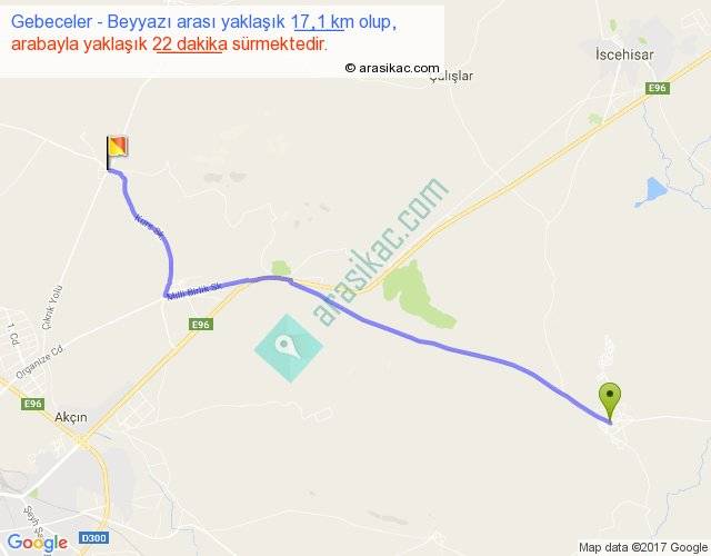 Gebeceler - Beyyazı arası yaklaşık olarak 90 km/h ile yukarıda belirtilen sürede olup, iki yerin kuş uçuşu uzaklığı (mesafesi) 15'dir. Yolculuk otobüsle 28 dakika sürmektedir.