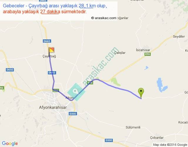 Gebeceler - Çayırbağ arası yaklaşık olarak 90 km/h ile yukarıda belirtilen sürede olup, iki yerin kuş uçuşu uzaklığı (mesafesi) 20'dir. Yolculuk otobüsle 35 dakika sürmektedir.