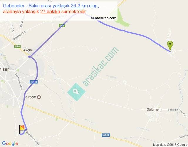 Gebeceler - Sülün arası yaklaşık olarak 90 km/h ile yukarıda belirtilen sürede olup, iki yerin kuş uçuşu uzaklığı (mesafesi) 17'dir. Yolculuk otobüsle 35 dakika sürmektedir.