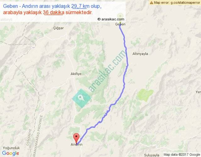 Geben - Andırın arası yaklaşık olarak 90 km/h ile yukarıda belirtilen sürede olup, iki yerin kuş uçuşu uzaklığı (mesafesi) 25'dir. Yolculuk otobüsle 46 dakika sürmektedir.