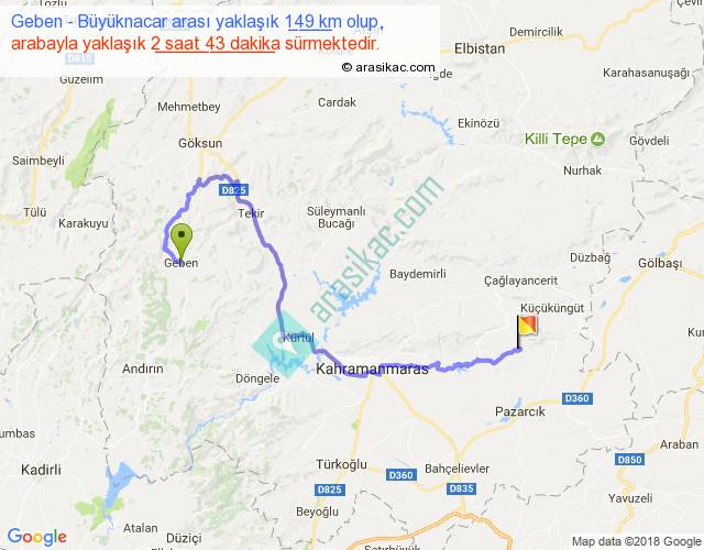 Geben - Büyüknacar arası yaklaşık olarak 90 km/h ile yukarıda belirtilen sürede olup, iki yerin kuş uçuşu uzaklığı (mesafesi) 76'dir. Yolculuk otobüsle 3 saat 31 dakika sürmektedir.