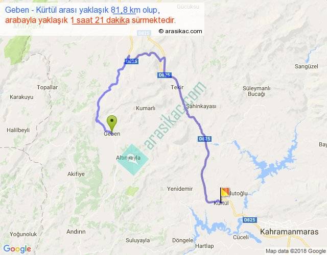 Geben - Kürtül arası yaklaşık olarak 90 km/h ile yukarıda belirtilen sürede olup, iki yerin kuş uçuşu uzaklığı (mesafesi) 30'dir. Yolculuk otobüsle 1 saat 45 dakika sürmektedir.