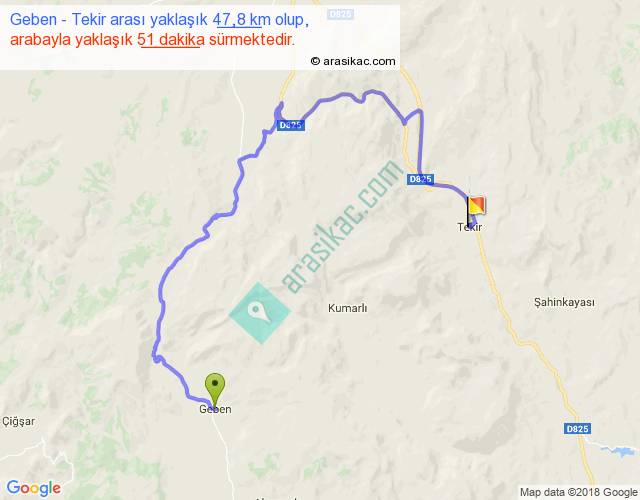 Geben - Tekir arası yaklaşık olarak 90 km/h ile yukarıda belirtilen sürede olup, iki yerin kuş uçuşu uzaklığı (mesafesi) 19'dir. Yolculuk otobüsle 1 saat 6 dakika sürmektedir.