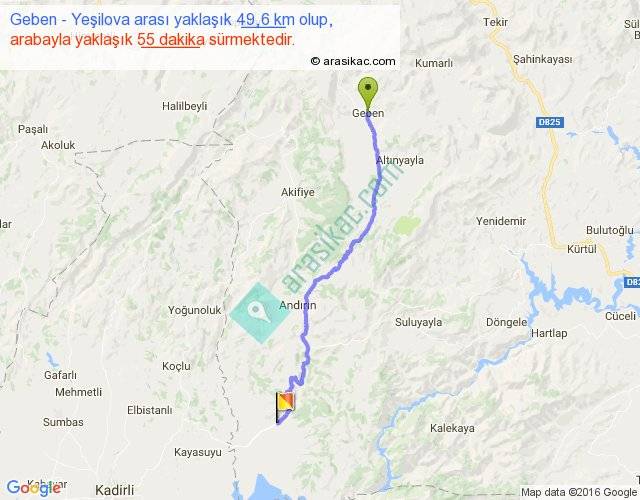 Geben - Yeşilova arası yaklaşık olarak 90 km/h ile yukarıda belirtilen sürede olup, iki yerin kuş uçuşu uzaklığı (mesafesi) 39'dir. Yolculuk otobüsle 1 saat 11 dakika sürmektedir.