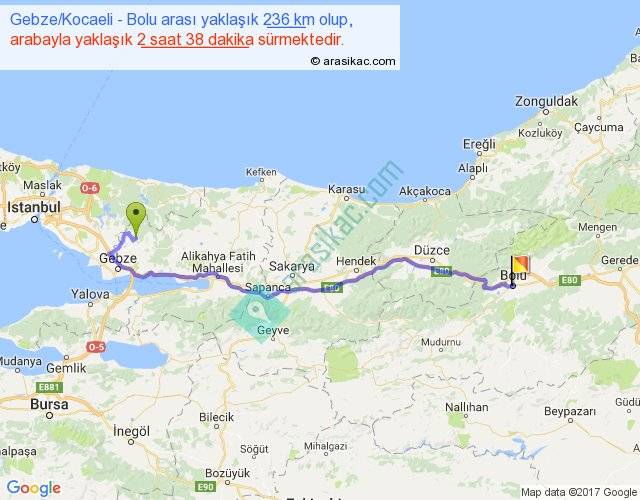 Gebze Kocaeli - Bolu arası yaklaşık olarak 90 km/h ile yukarıda belirtilen sürede olup, iki yerin kuş uçuşu uzaklığı (mesafesi) 175'dir. Yolculuk otobüsle 3 saat 25 dakika sürmektedir.