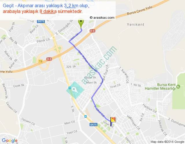 Geçit - Akpınar arası yaklaşık olarak 90 km/h ile yukarıda belirtilen sürede olup, iki yerin kuş uçuşu uzaklığı (mesafesi) 3'dir. Yolculuk otobüsle 10 dakika sürmektedir.