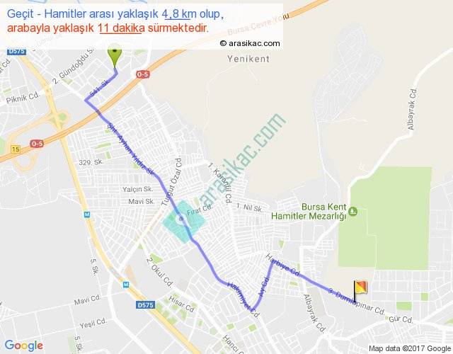 Geçit - Hamitler arası yaklaşık olarak 90 km/h ile yukarıda belirtilen sürede olup, iki yerin kuş uçuşu uzaklığı (mesafesi) 3'dir. Yolculuk otobüsle 14 dakika sürmektedir.
