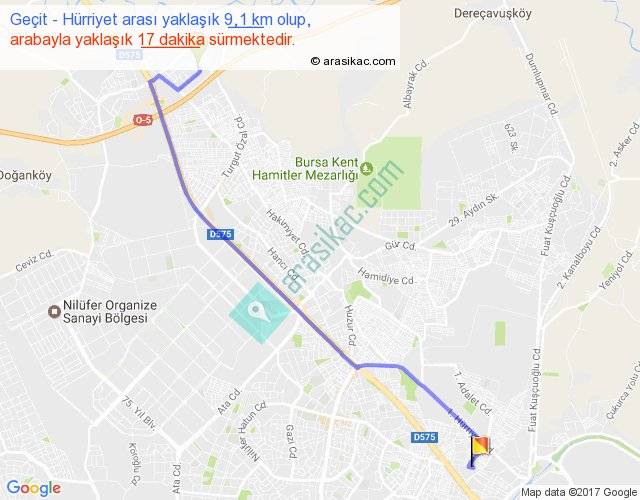 Geçit - Hürriyet arası yaklaşık olarak 90 km/h ile yukarıda belirtilen sürede olup, iki yerin kuş uçuşu uzaklığı (mesafesi) 7'dir. Yolculuk otobüsle 22 dakika sürmektedir.
