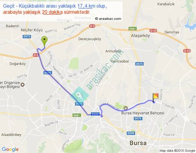 Geçit - Küçükbalıklı arası yaklaşık olarak 90 km/h ile yukarıda belirtilen sürede olup, iki yerin kuş uçuşu uzaklığı (mesafesi) 12'dir. Yolculuk otobüsle 26 dakika sürmektedir.