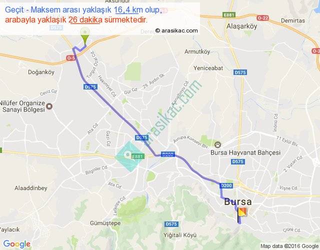 Geçit - Maksem arası yaklaşık olarak 90 km/h ile yukarıda belirtilen sürede olup, iki yerin kuş uçuşu uzaklığı (mesafesi) 14'dir. Yolculuk otobüsle 33 dakika sürmektedir.