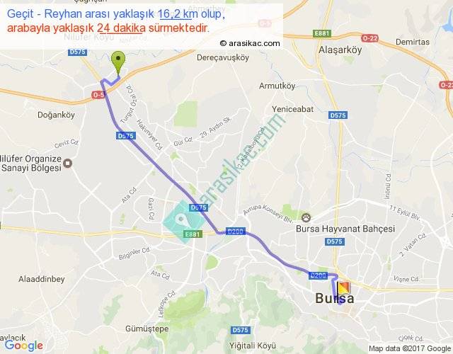 Geçit - Reyhan arası yaklaşık olarak 90 km/h ile yukarıda belirtilen sürede olup, iki yerin kuş uçuşu uzaklığı (mesafesi) 13'dir. Yolculuk otobüsle 31 dakika sürmektedir.
