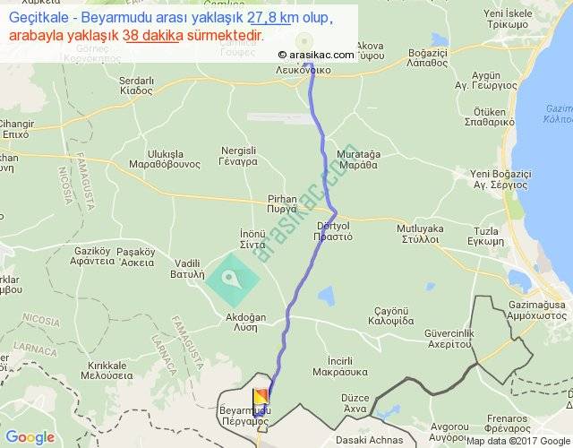 Geçitkale - Beyarmudu arası yaklaşık olarak 90 km/h ile yukarıda belirtilen sürede olup, iki yerin kuş uçuşu uzaklığı (mesafesi) 25'dir. Yolculuk otobüsle 49 dakika sürmektedir.