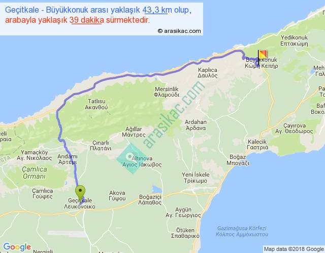 Geçitkale - Büyükkonuk arası yaklaşık olarak 90 km/h ile yukarıda belirtilen sürede olup, iki yerin kuş uçuşu uzaklığı (mesafesi) 28'dir. Yolculuk otobüsle 50 dakika sürmektedir.