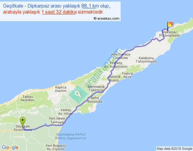 Geçitkale - Dipkarpaz arası yaklaşık olarak 90 km/h ile yukarıda belirtilen sürede olup, iki yerin kuş uçuşu uzaklığı (mesafesi) 72'dir. Yolculuk otobüsle 1 saat 59 dakika sürmektedir.