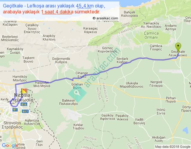 Geçitkale - Lefkoşa arası yaklaşık olarak 90 km/h ile yukarıda belirtilen sürede olup, iki yerin kuş uçuşu uzaklığı (mesafesi) 34'dir. Yolculuk otobüsle 1 saat 23 dakika sürmektedir.