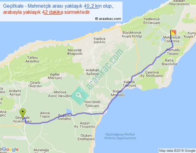 Geçitkale - Mehmetçik arası yaklaşık olarak 90 km/h ile yukarıda belirtilen sürede olup, iki yerin kuş uçuşu uzaklığı (mesafesi) 34'dir. Yolculuk otobüsle 54 dakika sürmektedir.