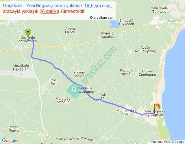 Geçitkale - Yeni Boğaziçi arası yaklaşık olarak 90 km/h ile yukarıda belirtilen sürede olup, iki yerin kuş uçuşu uzaklığı (mesafesi) 16'dir. Yolculuk otobüsle 33 dakika sürmektedir.