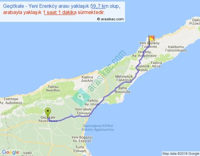 Geçitkale - Yeni Erenköy arası yaklaşık olarak 90 km/h ile yukarıda belirtilen sürede olup, iki yerin kuş uçuşu uzaklığı (mesafesi) 50'dir. Yolculuk otobüsle 1 saat 19 dakika sürmektedir.