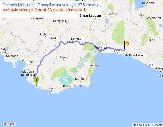 Gelemiş Mahallesi - Tasagil arası yaklaşık olarak 90 km/h ile yukarıda belirtilen sürede olup, iki yerin kuş uçuşu uzaklığı (mesafesi) 184'dir. Yolculuk otobüsle 4 saat 36 dakika sürmektedir.
