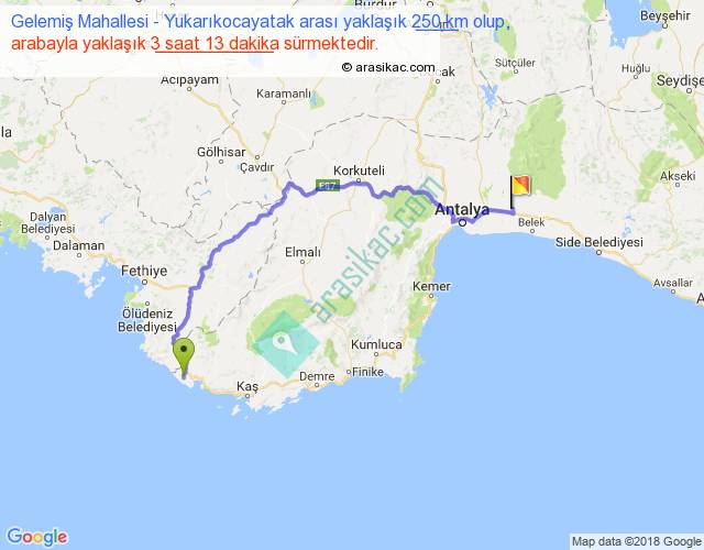 Gelemiş Mahallesi - Yukarıkocayatak arası yaklaşık olarak 90 km/h ile yukarıda belirtilen sürede olup, iki yerin kuş uçuşu uzaklığı (mesafesi) 164'dir. Yolculuk otobüsle 4 saat 10 dakika sürmektedir.