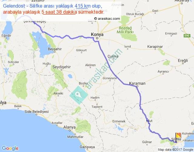 Gelendost - Silifke arası yaklaşık olarak 90 km/h ile yukarıda belirtilen sürede olup, iki yerin kuş uçuşu uzaklığı (mesafesi) 321'dir. Eğer belirtilen yerler arasında uçak seferi var ise bu süre uçakla 29 dakika'ya kadar düşebilir. Yolculuk otobüsle 7 saat 19 dakika sürmektedir.