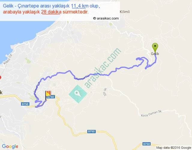 Gelik - Çınartepe arası yaklaşık olarak 90 km/h ile yukarıda belirtilen sürede olup, iki yerin kuş uçuşu uzaklığı (mesafesi) 6'dir. Yolculuk otobüsle 36 dakika sürmektedir.
