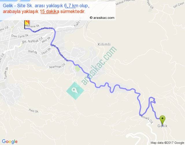 Gelik - Site Sk. arası yaklaşık olarak 90 km/h ile yukarıda belirtilen sürede olup, iki yerin kuş uçuşu uzaklığı (mesafesi) 4'dir. Yolculuk otobüsle 19 dakika sürmektedir.
