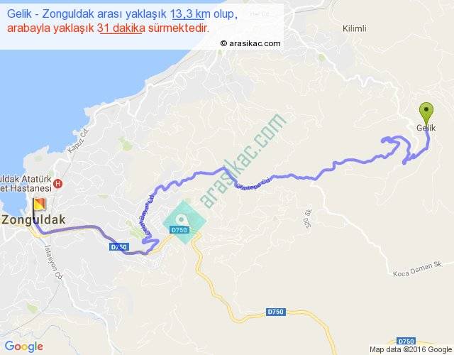Gelik - Zonguldak arası yaklaşık olarak 90 km/h ile yukarıda belirtilen sürede olup, iki yerin kuş uçuşu uzaklığı (mesafesi) 8'dir. Yolculuk otobüsle 40 dakika sürmektedir.