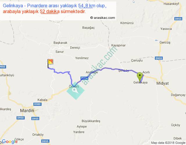 Gelinkaya - Pınardere arası yaklaşık olarak 90 km/h ile yukarıda belirtilen sürede olup, iki yerin kuş uçuşu uzaklığı (mesafesi) 39'dir. Yolculuk otobüsle 1 saat 7 dakika sürmektedir.