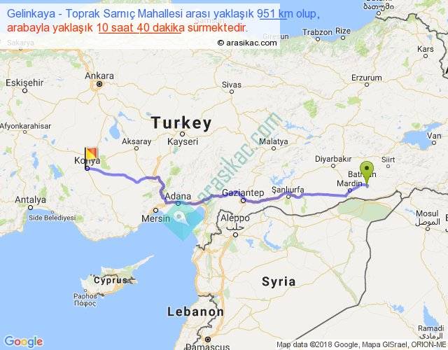 Gelinkaya - Toprak Sarnıç Mahallesi arası yaklaşık olarak 90 km/h ile yukarıda belirtilen sürede olup, iki yerin kuş uçuşu uzaklığı (mesafesi) 772'dir. Eğer belirtilen yerler arasında uçak seferi var ise bu süre uçakla 1 saat 11 dakika'ya kadar düşebilir. Yolculuk otobüsle 13 saat 52 dakika sürmektedir.