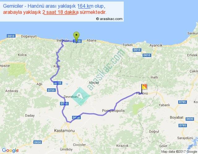 Gemiciler - Hanönü arası yaklaşık olarak 90 km/h ile yukarıda belirtilen sürede olup, iki yerin kuş uçuşu uzaklığı (mesafesi) 61'dir. Yolculuk otobüsle 2 saat 59 dakika sürmektedir.