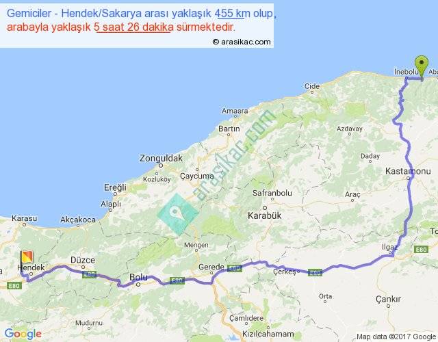Gemiciler - Hendek Sakarya arası yaklaşık olarak 90 km/h ile yukarıda belirtilen sürede olup, iki yerin kuş uçuşu uzaklığı (mesafesi) 295'dir. Eğer belirtilen yerler arasında uçak seferi var ise bu süre uçakla 27 dakika'ya kadar düşebilir. Yolculuk otobüsle 7 saat 3 dakika sürmektedir.