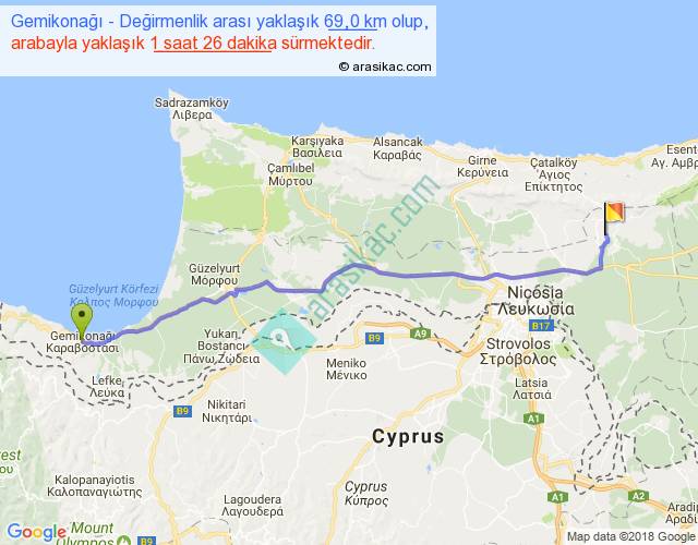 Gemikonağı - Değirmenlik arası yaklaşık olarak 90 km/h ile yukarıda belirtilen sürede olup, iki yerin kuş uçuşu uzaklığı (mesafesi) 61'dir. Yolculuk otobüsle 1 saat 51 dakika sürmektedir.