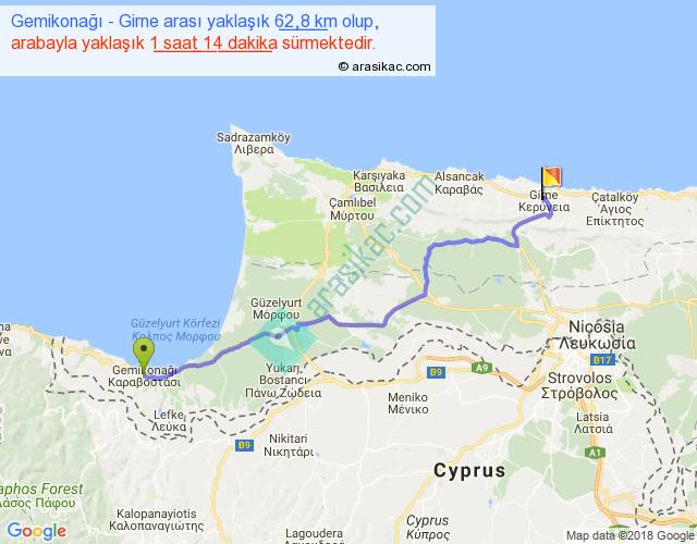 Gemikonağı - Girne arası yaklaşık olarak 90 km/h ile yukarıda belirtilen sürede olup, iki yerin kuş uçuşu uzaklığı (mesafesi) 50'dir. Yolculuk otobüsle 1 saat 36 dakika sürmektedir.