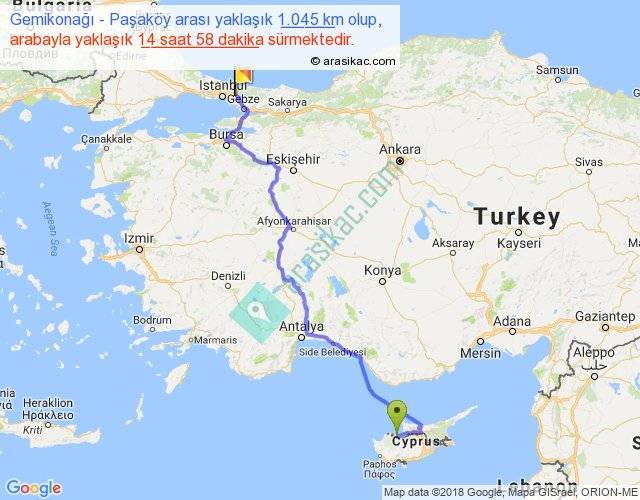 Gemikonağı - Paşaköy arası yaklaşık olarak 90 km/h ile yukarıda belirtilen sürede olup, iki yerin kuş uçuşu uzaklığı (mesafesi) 718'dir. Eğer belirtilen yerler arasında uçak seferi var ise bu süre uçakla 1 saat 06 dakika'ya kadar düşebilir. Yolculuk otobüsle 19 saat 27 dakika sürmektedir.