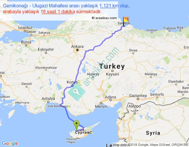Gemikonağı - Ulugazi Mahallesi arası yaklaşık olarak 90 km/h ile yukarıda belirtilen sürede olup, iki yerin kuş uçuşu uzaklığı (mesafesi) 745'dir. Eğer belirtilen yerler arasında uçak seferi var ise bu süre uçakla 1 saat 08 dakika'ya kadar düşebilir. Yolculuk otobüsle 20 saat 49 dakika sürmektedir.
