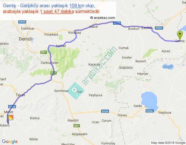 Gemiş - Garipköy arası yaklaşık olarak 90 km/h ile yukarıda belirtilen sürede olup, iki yerin kuş uçuşu uzaklığı (mesafesi) 79'dir. Yolculuk otobüsle 2 saat 19 dakika sürmektedir.