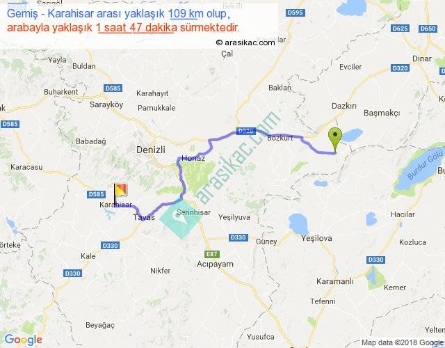 Gemiş - Karahisar arası yaklaşık olarak 90 km/h ile yukarıda belirtilen sürede olup, iki yerin kuş uçuşu uzaklığı (mesafesi) 78'dir. Yolculuk otobüsle 2 saat 19 dakika sürmektedir.