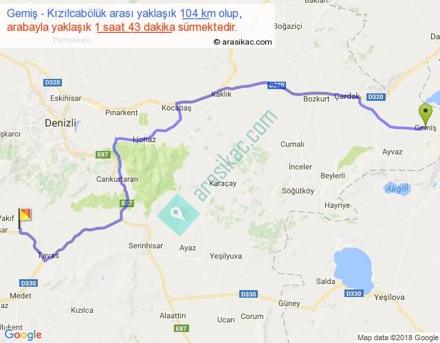 Gemiş - Kızılcabölük arası yaklaşık olarak 90 km/h ile yukarıda belirtilen sürede olup, iki yerin kuş uçuşu uzaklığı (mesafesi) 73'dir. Yolculuk otobüsle 2 saat 13 dakika sürmektedir.