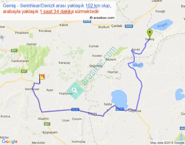 Gemiş - Serinhisar Denizli arası yaklaşık olarak 90 km/h ile yukarıda belirtilen sürede olup, iki yerin kuş uçuşu uzaklığı (mesafesi) 49'dir. Yolculuk otobüsle 2 saat 2 dakika sürmektedir.