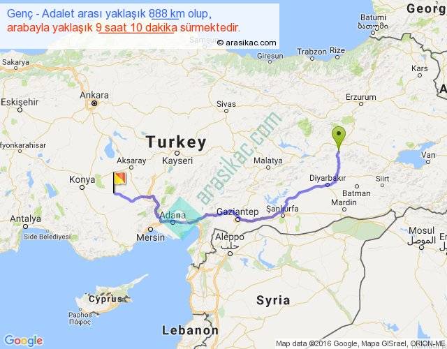 Genç - Adalet arası yaklaşık olarak 90 km/h ile yukarıda belirtilen sürede olup, iki yerin kuş uçuşu uzaklığı (mesafesi) 622'dir. Eğer belirtilen yerler arasında uçak seferi var ise bu süre uçakla 57 dakika'ya kadar düşebilir. Yolculuk otobüsle 11 saat 55 dakika sürmektedir.