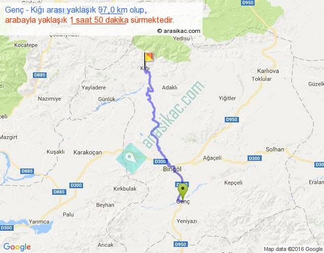 Genç - Kiğı arası yaklaşık olarak 90 km/h ile yukarıda belirtilen sürede olup, iki yerin kuş uçuşu uzaklığı (mesafesi) 65'dir. Yolculuk otobüsle 2 saat 23 dakika sürmektedir.