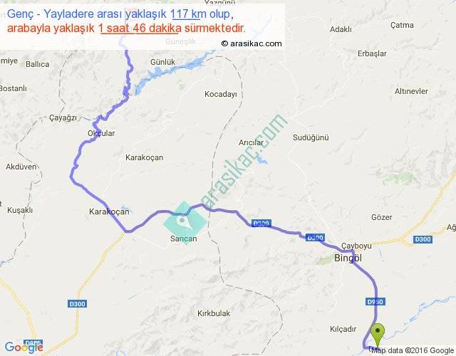 Genç - Yayladere arası yaklaşık olarak 90 km/h ile yukarıda belirtilen sürede olup, iki yerin kuş uçuşu uzaklığı (mesafesi) 67'dir. Yolculuk otobüsle 2 saat 17 dakika sürmektedir.