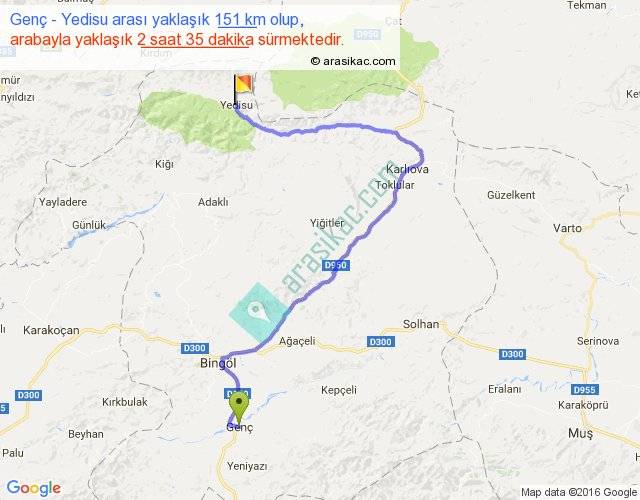 Genç - Yedisu arası yaklaşık olarak 90 km/h ile yukarıda belirtilen sürede olup, iki yerin kuş uçuşu uzaklığı (mesafesi) 76'dir. Yolculuk otobüsle 3 saat 21 dakika sürmektedir.