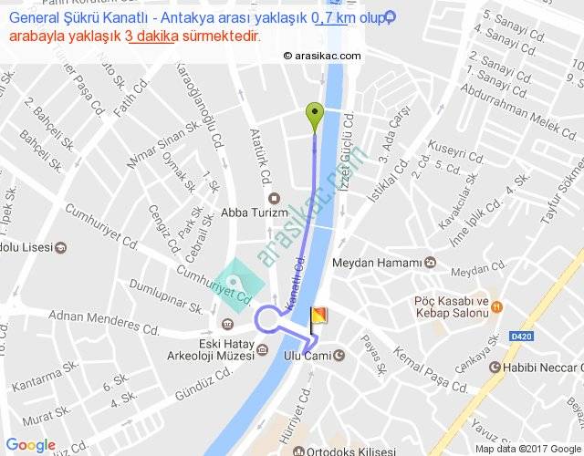 General Şükrü Kanatlı - Antakya arası yaklaşık olarak 90 km/h ile yukarıda belirtilen sürede olup, iki yerin kuş uçuşu uzaklığı (mesafesi) 0'dir. Yolculuk otobüsle 3 dakika sürmektedir.