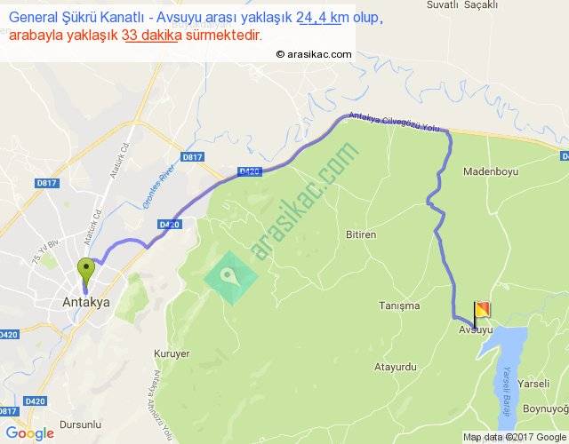 General Şükrü Kanatlı - Avsuyu arası yaklaşık olarak 90 km/h ile yukarıda belirtilen sürede olup, iki yerin kuş uçuşu uzaklığı (mesafesi) 14'dir. Yolculuk otobüsle 42 dakika sürmektedir.